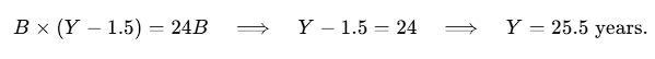 Solving for the point where gratuity = 24B reveals it happens at about 25.5 years of service. In other words: